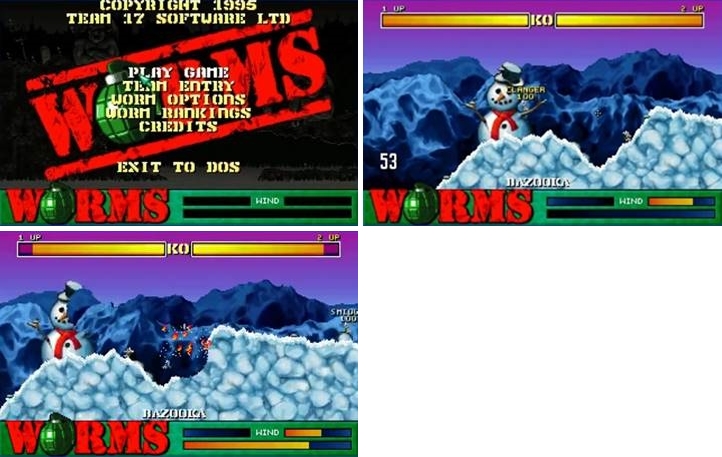 1995년도에 Team17에서 제작한 웜즈는 스코치드 어스류의 각도 슈팅 게임입니다. 기본 무기는 바쥬카지만 그 외에도 각종 기상천외한 무기들을 사용해서 적과 싸울 수 있었죠(심지어 후기작에는 스트리트파이터를 패러디한 류의 파동권과 승룡권도 등장합니다)