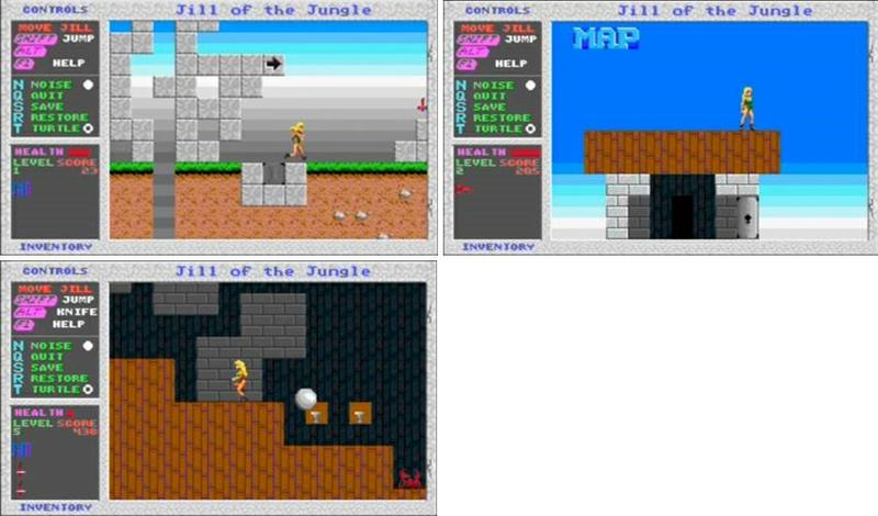 그중에서도 질(Jill)시리즈는 셰어웨어로 무료로 풀려서 꽤 많은 플레이들이 접해본 기억이 있을 겁니다. 게임 자체는 매우 단순합니다. 주인공 질은 기본적으로 점프와 매달리기 등으로 게임을 진행하는데 무기 아이템을 얻게 되면 슈팅이 가능해집니다.